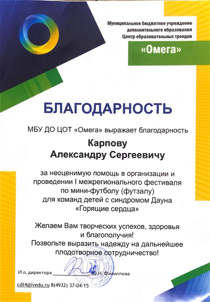 Благодарность от МБУ ДО ЦОТ "ОМЕГА" за помощь в организации I Межрегионального фестиваля по мини-футболу (футзалу) для команд детей с синдромом Дауна "Горящие сердца"